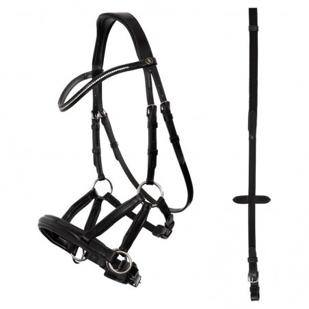 Le cuir avec une doublure douce au niveau de la muserolle et de la têtière assure une action moins forte sur le nez et les oreilles du cheval. Lorsque vous tirez sur les rênes votre cheval ressent principalement une pression sur le nez et le menton et éventuellement un peu de pression sur les oreilles. Le bridon est facile à régler grâce aux boucles brillantes.