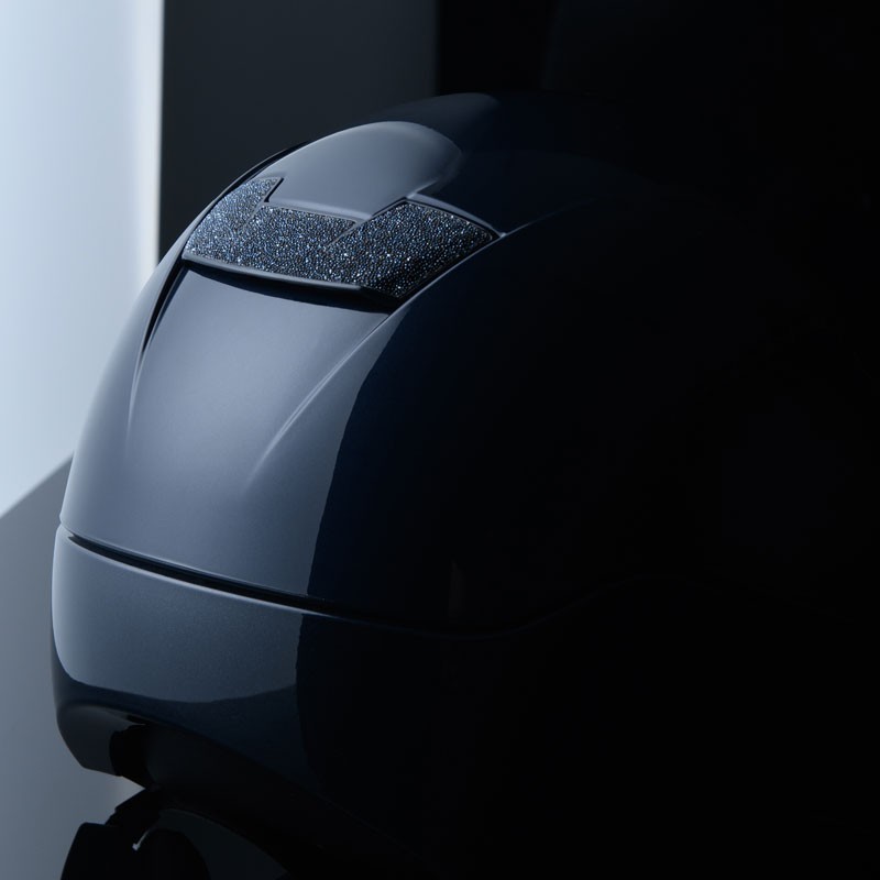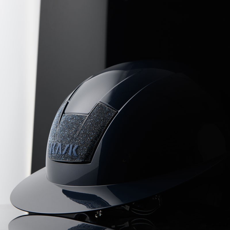 KASK Kooki Lady Swarovski Navy Shine. Belle casquette de sécurité KASK bleue brillante avec un style très agréable et un confort de port élevé. Ce bouchon de sécurité est composé de deux coques. La coque qui se porte directement sur la tête est la coque en PC thermoformé EPS. Ceci, en combinaison avec la coque extérieure en ABS, assure une sécurité maximale. La casquette est équipée d'une doublure hydrophile respirante et antibactérienne et possède des fentes d'aération à l'avant et à l'arrière. Le KASK Kooki Lady Swarovski Carpet Navy Shine a une grande visière et est fini avec Swarovski Carpet à l'avant et à l'arrière. Cette finition donne au bouchon un look exclusif.