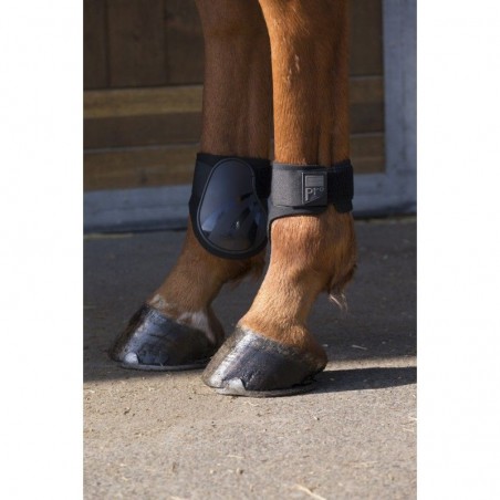 Protège-boulets avec coquille extérieure en plastique moulé doublé d'un épais néoprène. Fermeture latérale par bande-auto-agrippante. En France, autorisés en compétition jeunes chevaux, pour les épreuves chevaux 7 ans et les épreuves des divisions poney, club et préparatoire.