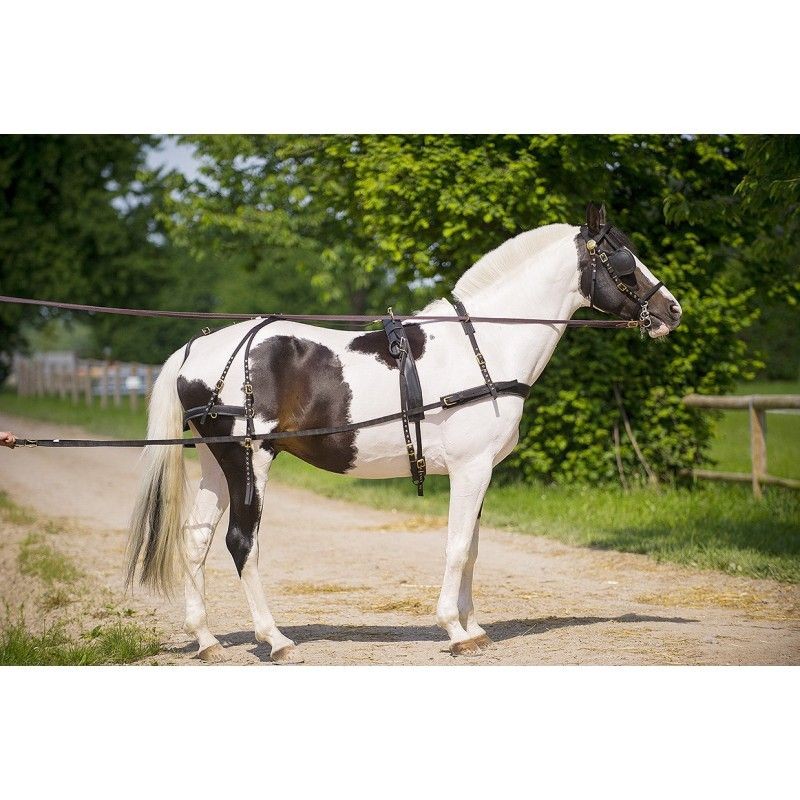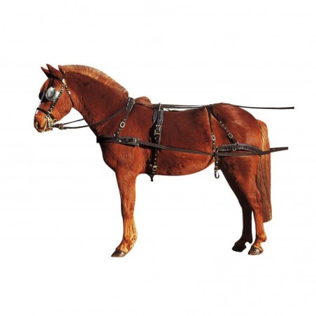Ce harnais solide et quasiment sans entretien est prévu pour la promenade en voiture légère à deux roues. - Têtière de 35 mm de large, bouclerie, fleurons et oeillets de réglage en laiton, oeillères en P.V.C. rigide. - Sellette 100 mm de large avec bracelets de brancards renforcés cuir, sous-ventrière matelassée 60 mm de large, anneaux de sellette, chape de croupière, bouclerie et oeillets de réglage en laiton. - Bricole matelassée de 60 mm de large, surcou matelassé de 50 mm de large équipé de deux passages de guide laiton, bouclerie et oeillets de réglage laiton. - Reculement constitué d'un avaloir matelassé de 50 mm de large, d'une barre de fesses renforcée de 40 mm de large et de courroies de reculement. Croupière traditionnelle réglable avec culeron en cuir. - Traits de 25 mm de large avec fixation de palonniers et de bricole renforcées cuir. Guides en sangle brune 18 mm de large.